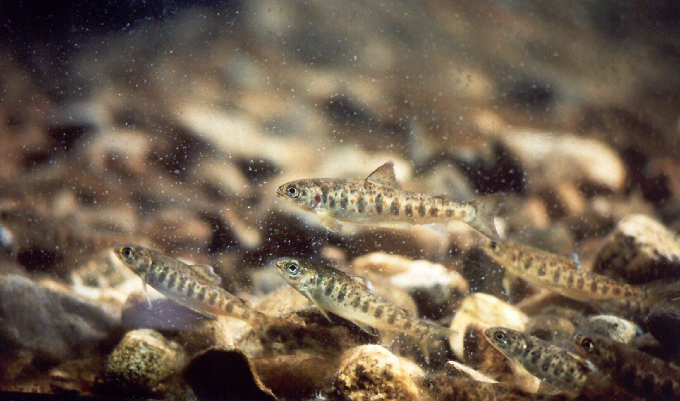 Salmon fry continue to grow by eating microscopic organisms in the river, eventually growing into parr. At this stage they develop vertical marks along the sides of their bodies.